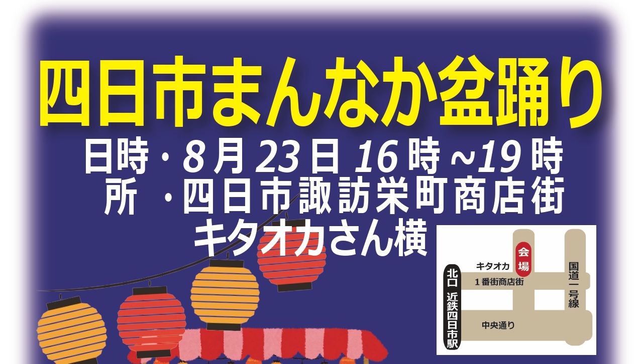 四日市まんなか盆踊りを8月23日(土)に開催します。当日をどうぞお楽しみに! 日時:8月23日(土) 16時~19時 場所 :四日市商店街アーケード内 キタオカ横