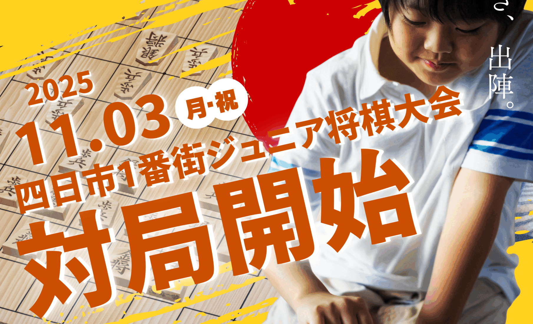 「四日市一番街ジュニア将棋大会」を今年も開催いたします! 令和7年11月3日(月・祝) 13:00 〜 後援:四日市市・四日市教育委員会 様協力:日本将棋連盟四日市支部 様 アマチュア将棋連盟東海ブロックみえ 様